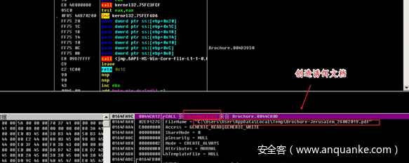 通过CreateFile 函数将文件源数据写入%Temp%\Brochure-Jerusalem_26082019.pdf (诱饵文件)中
