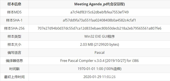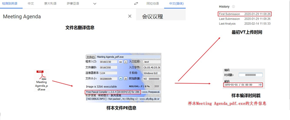 但由于其塞入数据的错误导致该Meeting Agenda.pdf 文件无法正常打开故此将该样本归因到未知类题材,之后的行为就和之前的如出一辙了,在此就不必多费笔墨。