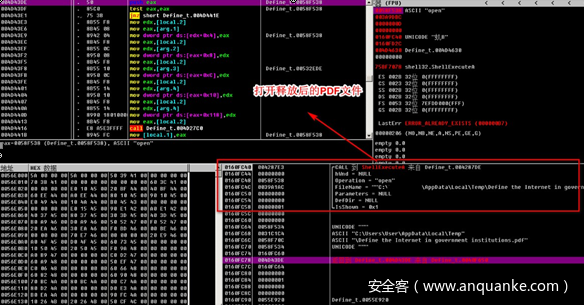 通过ShellExecute 函数打开PDF诱饵文档,以免引起目标怀疑