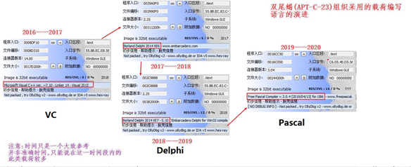 根据 360 的报告我们可以得知双尾蝎APT组织在 2016 年到 2017 年这段时间内该组织主要采用了VC 去编写载荷.再到 2017 年到 2018 年这段时间内该组织主要是以Delphi 来编写其侦查者(Recon),根据Gcow 安全团队追影小组的跟踪,该组织在 2018 年到 2019 年这段时间内也使用了Delphi 编写的恶意载荷。