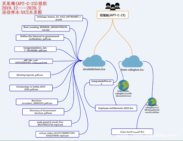 该组织拥有很强的攻击能力,其载荷涵盖较广(Windows和Android平台).并且在被以色列进行导弹物理 打击后快速恢复其攻击能力.对巴勒斯坦地区进行了一波较为猛烈的攻势,同时我们绘制了一幅本次活动 之中样本与C&C 的关系图