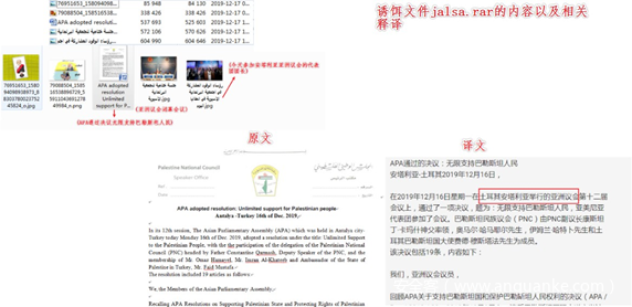 从诱饵样本中的内容我们可以看出其关于巴勒斯坦态势的问题,属于政治类诱饵样本