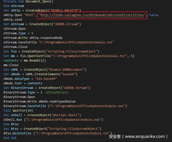 同时其包含的恶意宏代码如图所示,由于我们并没有能成功获得下一步的载荷,故没法进行下一步的分析。不过推测其大致功能应该与上文相同