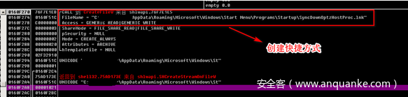 利用CreateFilewW 函数在自启动文件夹下创造指向%ProgramData%\SyncDownOptzHostProc.exe 的快捷方式SyncDownOptzHostProc.lnk