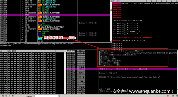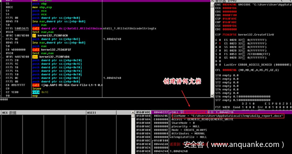 通过CreateFile 函数将docx 文件源数据写入%Temp%\daily_report.docx (诱饵文件)中