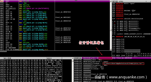 通过ShellExecute 函数将%Temp%\jalsa.rar 打开
