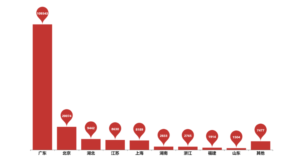 通过对加固应用区域进行统计发现,北上广一线城市的应用加固数量较多,尤其是广东省和北京市,近半的加固应用都来自这两个区域。详见图13: