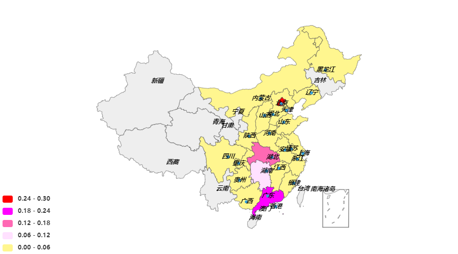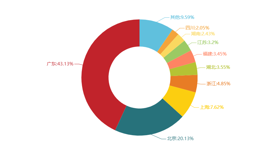 从漏洞的区域分布来看,北上广仍是漏洞应用数量最多的区域,其中广东省存在漏洞应用数量占总量的43.13%,排名第二的是北京市,占总量的20.13%,排名第三的是上海市,占总量的7.62%。详见图7: