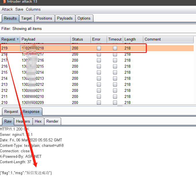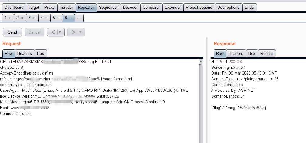 观察服务器返回信息或者查看手机短信,连续调用短信接口200多次对不同手机号发送短信成功,存在恶意调用 接口发送短信的风险,造成短信发送平台花费大量的短信费用,且易造成骚扰短信,影响用户的正常生活。