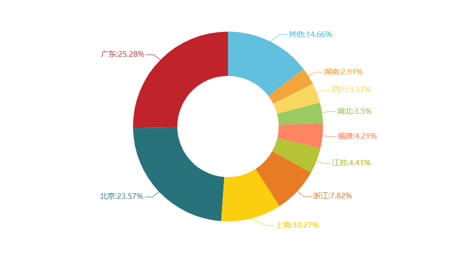 从嵌入第三方SDK的App所处区域来看,广东省嵌入SDK的应用数量最多,占嵌入SDK应用数量28.79%,其次是北京市的应用,占比为23.01%;位列第三的是上海市的应用,占比为11.47%。详见图12: