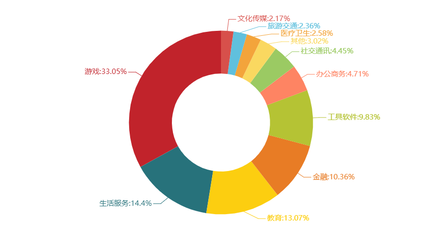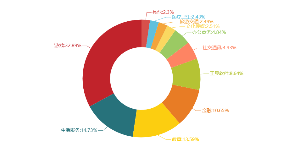 游戏类应用数量占总量的32.89%;生活服务类App位居第二,占总量14.73%;教育类App排名第三,占总量的13.59%。详见图2:
