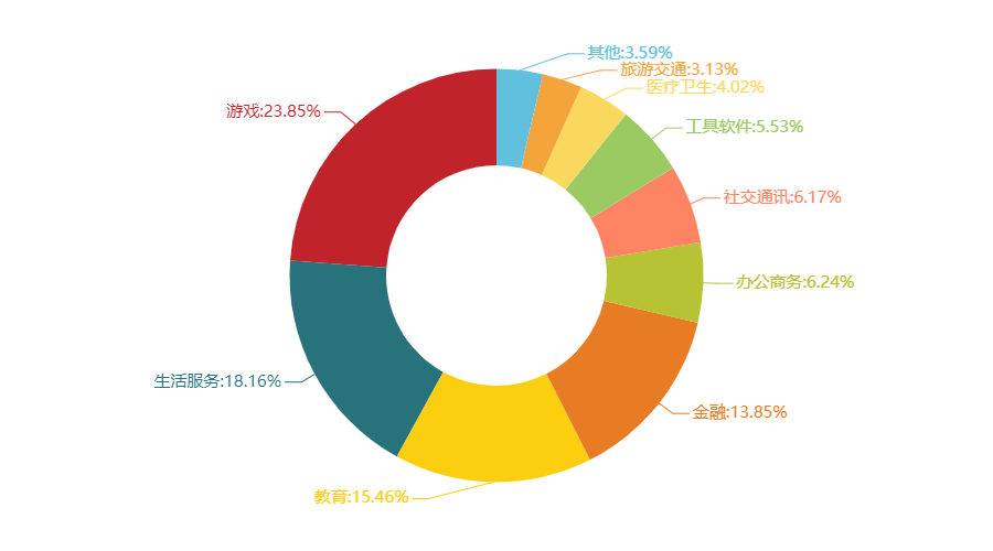 从嵌入第三方SDK的App所处行业类型来看,游戏类应用嵌入SDK的App数量最多,占比为23.85%,其次是生活服务类应用,有占比为18.16%;位列第三的是教育类应用,占比为15.46%。 详见图11: