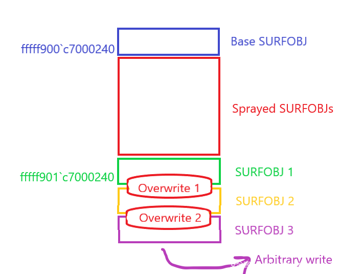 fffff901'c7000240 - 通过越界写修改掉第二个SURFOBJ对象的
