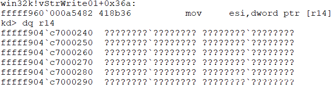 崩溃时的 rip 指向的指令是 mov esi,dword ptr [r14] 这条指令在win32k当中 win32k!vStrWrite01+0x36a 在这个位置设置一个断点,能够得到下面的结果。