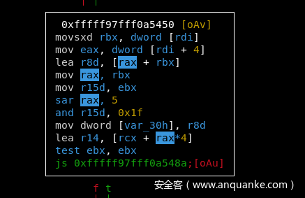 精确的定位 sizlBitmap 的高度或者宽度才是一个挑战,这两个值是通过 lea r14 [rcx + rax * 4] 来设置的。但是现在我们还没有找到 rax 的值是怎么被设定的。如果能够控制 rax 的值,就能够实现精确的越界写。