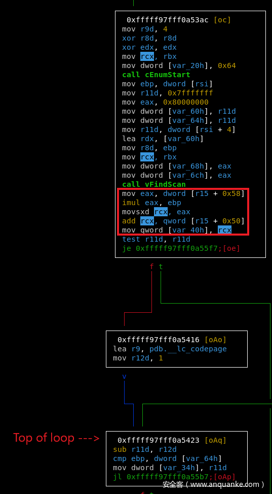 接着 rcx 寄存器在 vStrWrite01 函数的地一个基本块当中被初始化,然后在下面的循环中继续处理