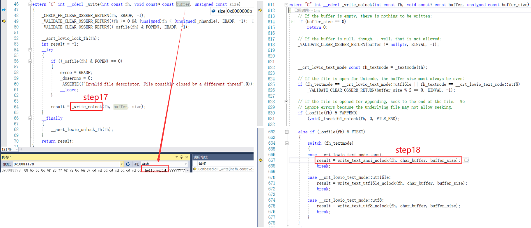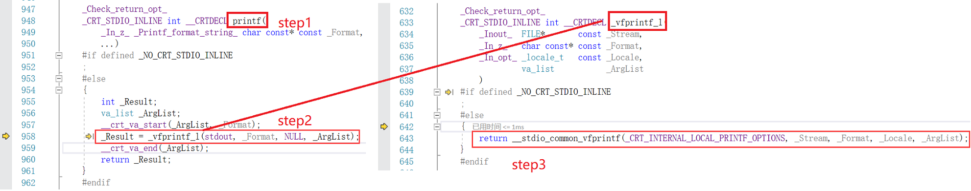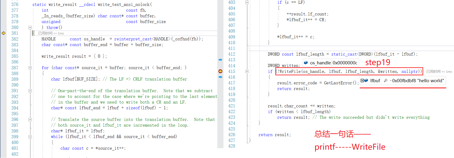 每隔500ms就打印一下字符串“hello world\n”;下边来跟一下VC运行时库的源码;源码步骤比较繁琐,如果不感兴趣可直接略过,看后边的结论;总结起来就是一句话printf——->WriteFile();
