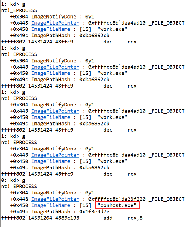 1: kd> ba r4 0xffff9401`cdf953a4 "dt @$proc _EPROCESS -yn Image"