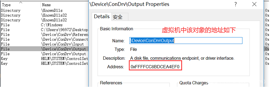 里边的很多字段暂时不用管,后边会专门撰文写Windows内核里对象管理的实现原理,但有一个信息是值得我们关注的,就是这个对象的类型是File,即文件;简单说明下,在Windows内核里,对象都是有类型的,就像应用层一样,每个对象都有其所对应的类类型,进程的对象类型为Process,线程的对象类型为Thread,等等,自然的文件对象的类型即为File了;那下边具体看下这个文件有什么特别的,且看下边的操作: