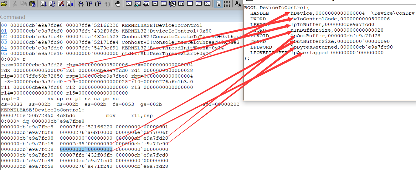 原来conhost.exe是通过这个DeviceIoControl()API通过500006这个控制码跟驱动要的数据;