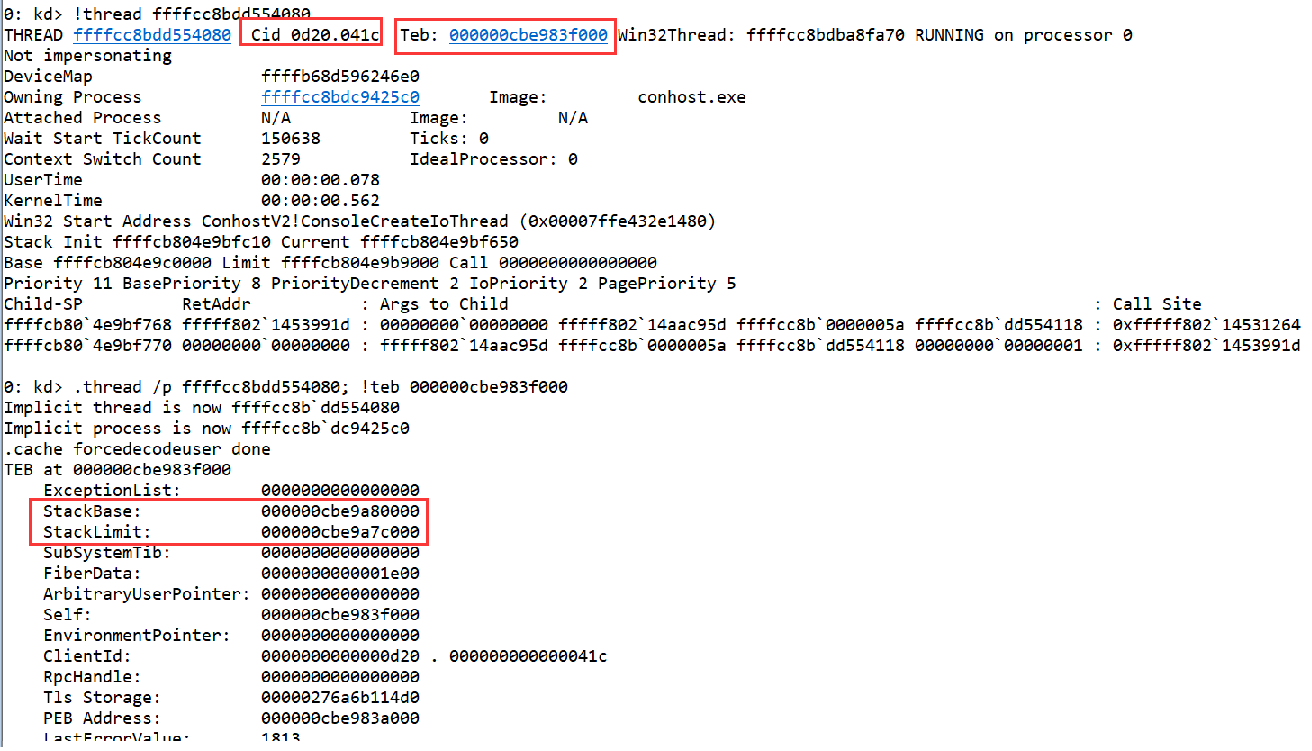 可以知道的信息有线程的ID,线程的Teb信息,有了这些,直接用用户态调试器直接调试即可,但已经用到了内核调试器,那就简单看下当前的线程在干啥吧,看下他的用户态栈;大致浏览下信息,看看有没有什么特别的API调用;