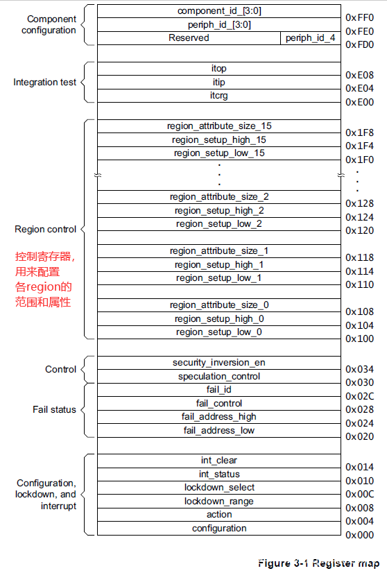 通过对region对应的控制寄存器进行设置来配置安全内存地址空间: