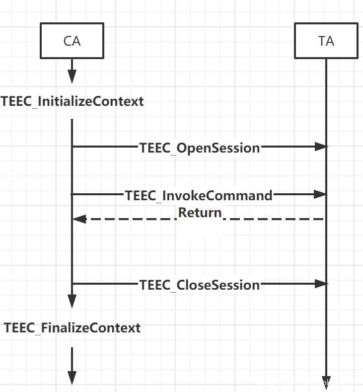 下面以符合GP规范的TEE接口为例,简单介绍下CA和TA的通信流程: