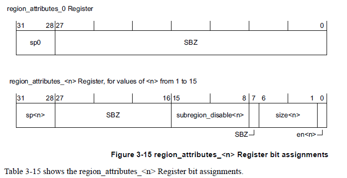 subregion_disable<n>: region被划分为8个相同大小的sub-regions,第一位表示相应的subregion是否disabled。