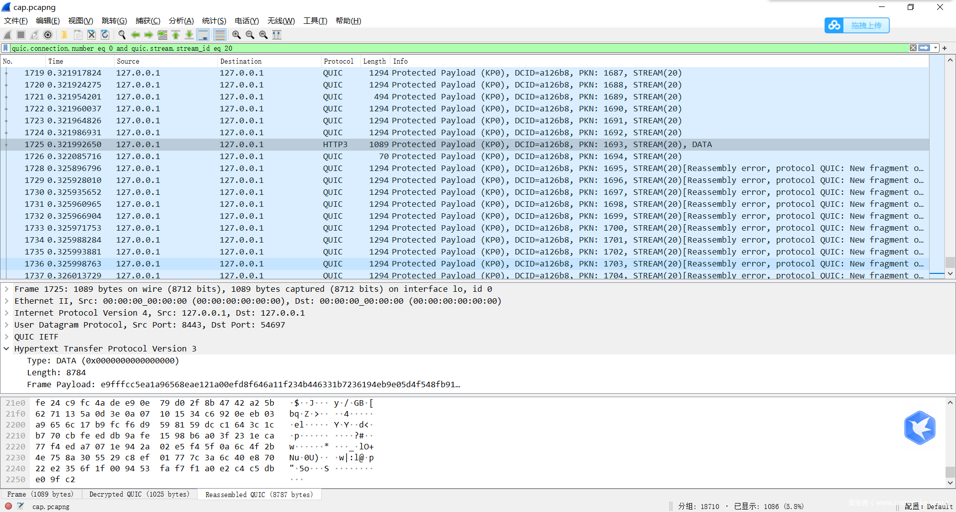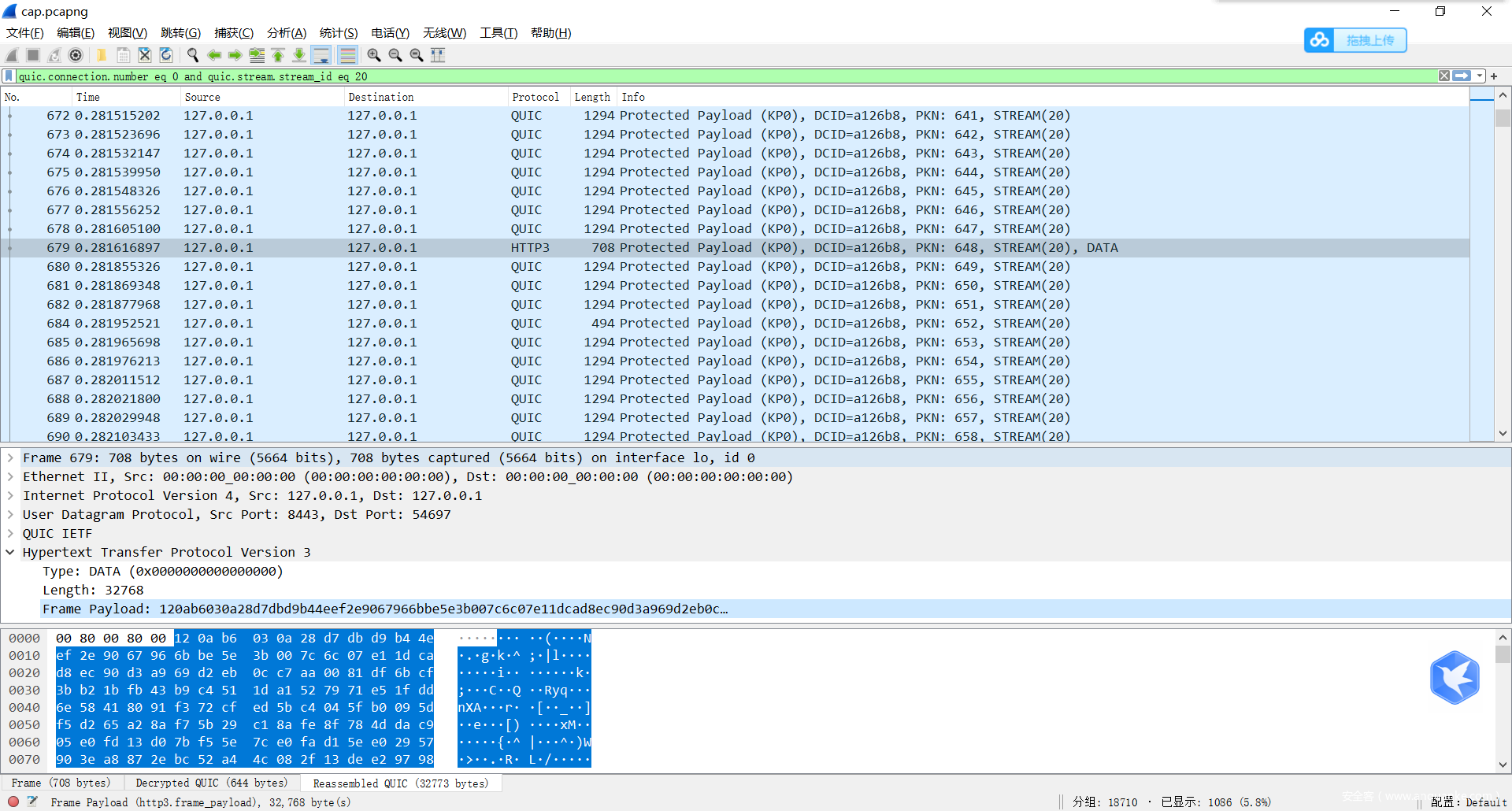 首先拿到流量包 发现为QUIC协议,一种udp协议(更加稳定)。