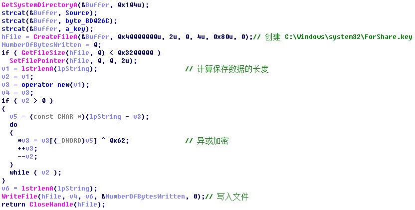 - 键盘记录,通过异或0x62加密后保存到C:\Windows\system32\ForShare.key。