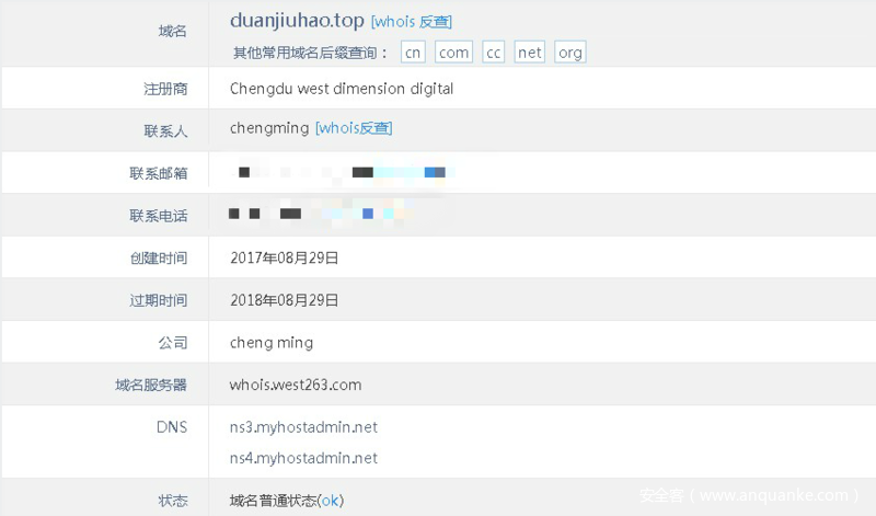 根据CC地址duanjiuhao.top的域名信息获取到了域名持有者的姓名、邮箱、手机号。