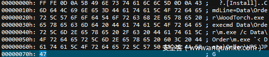 程序在执行起来后会读取同目录下的setup.ini文件,根据配置文件中Install项里的CmdLine执行命令。而文件常规打开是一堆乱码,在十六进制试图下可以清楚看到Cmdline命令。