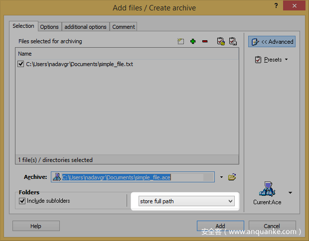 要理解ACE文件格式,让我们创建一个简单的.txt文件(名为“simple_file.txt”),并使用WinACE对其进行压缩。 然后,我们将使用acefile检查ACE文件的标头。