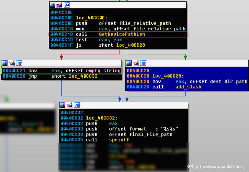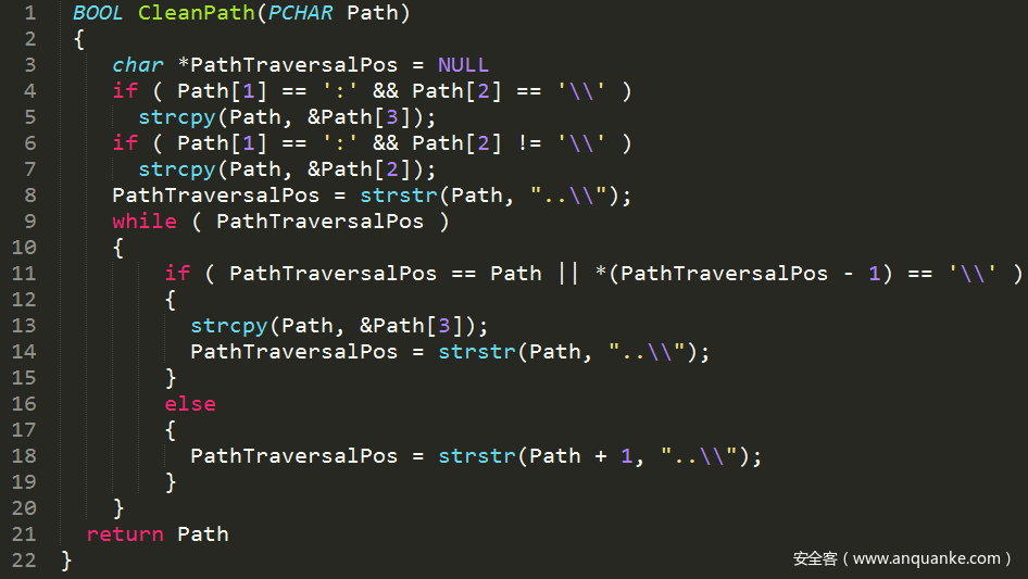但是,unacev2.dll中有一个名为CleanPath的过滤器函数(图17),它会检查相对路径是否以C:开头,并在调用GetDevicePathLen之前将其从相对路径字符串中删除。