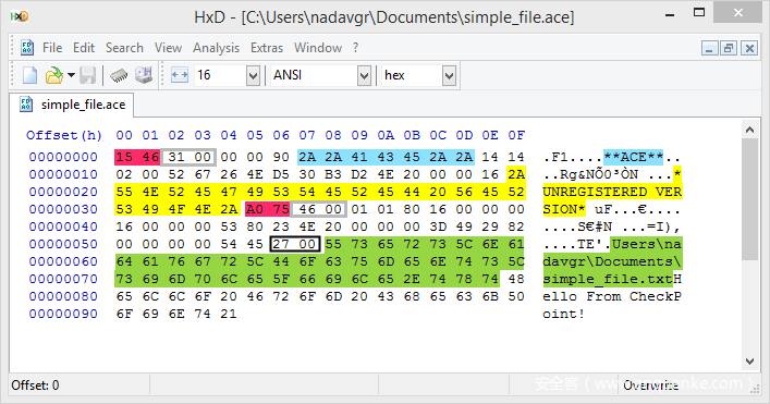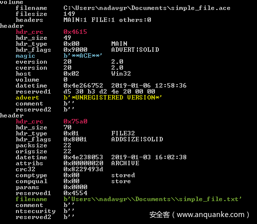 为清楚起见,相同的字段在ace 文件中的十六进制转储和输出中用相同的颜色标记。
