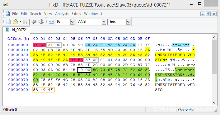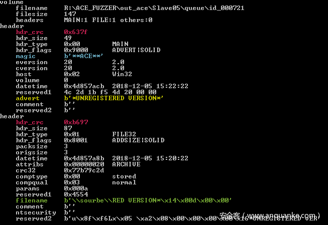·为方便起见,字段在十六进制转储中以相同的颜色标记acefile的输出。
