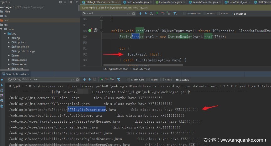 工作陷入僵局,想着RCE是不可能了,挖掘XXE看看能挖到不。当时爆出反序列化XXE的CVE:CVE-2019-2647、CVE-2019-2648、CVE-2019-2649、CVE-2019-2650,直接感觉还有XXE,人工审计太麻烦了,写一款辅助审计的工具。工具思路比较简单就是正则匹配XML解析的库和实现了序列化接口的类都打印出来,人工审计反序列操作有没有问题就可以了。第一个问题weblogic的jar包都是字节码文件需要还原成XXX.java。可以通过jd-gui来还原。下面把源码给出来: