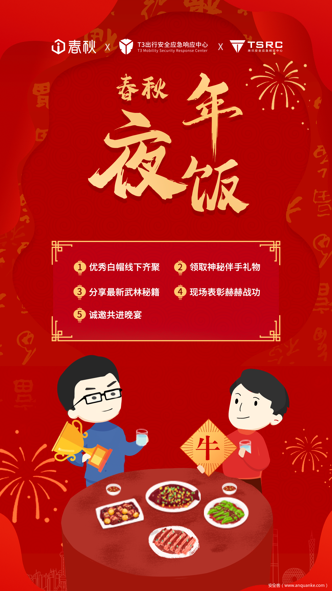 为答谢一直以来与i春秋同舟共济的网络安全从业者,i春秋将联合T3出行SRC、腾讯SRC共同发起线下沙龙活动。但受近期疫情复发的影响,响应国家号召,避免大规模人员聚集所带来的安全隐患,遂决定改为小范围内、不同城市、多站巡回「年夜饭-技术趴」,与T3出行SRC、腾讯SRC一起走到线下,走进白帽子生活的城市,共同发声,致敬感谢。