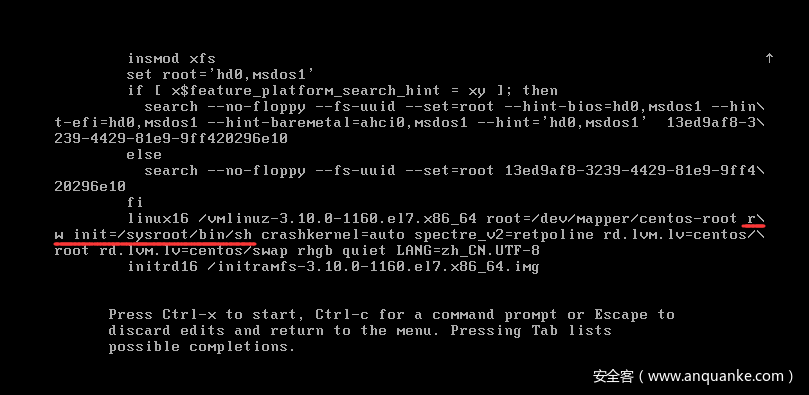 找到linux16开头的那一段,将ro修改为rw init=/sysroot/bin/sh,按<kbd>ctrl</kbd>+<kbd>x</kbd>进入单用户模式