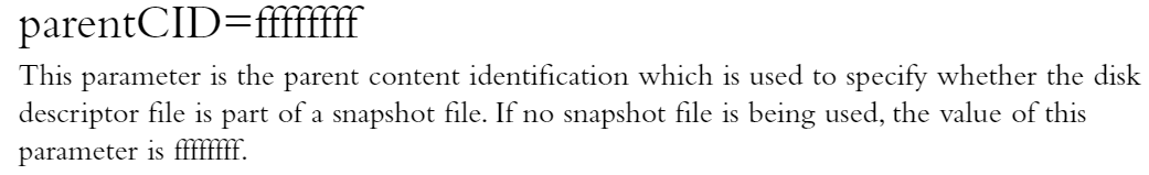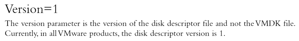 参考文档,对比正确的vmdk,可以发现第一部分缺少了version、parentCID和磁盘文件的编号,文档中也有写