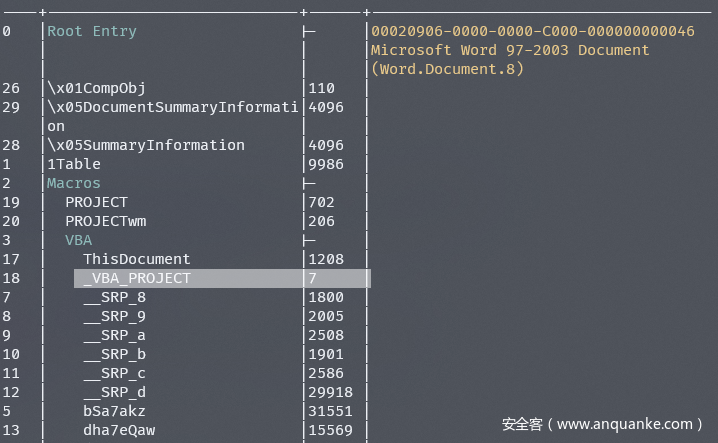 _VBA_PROJECT7字节可以视作该技术的标志。vba_purging可以阻止一些依赖P-code进行vba提取的工具, 比如olevba.exe。