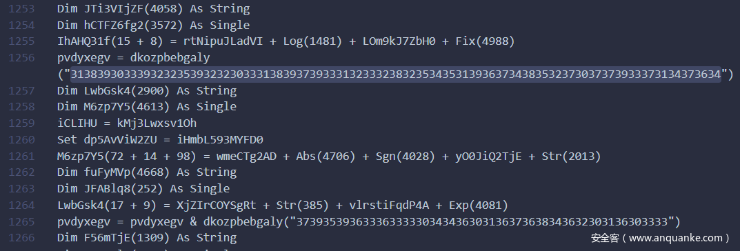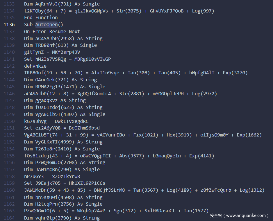 可以看到大段的junk, 由于On Error Resume Next, 无意义的调用就算出错也会继续运行。在执行几行junk后, 可以看到与之差异很大的代码: