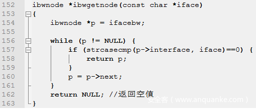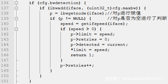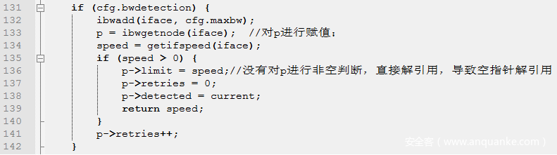 在缺陷代码中, 指针 P 在第133行通过 ibwgetnode(iface) 函数返回值进行赋值,并在第136行 p->limit=speed; 中进行使用,通过 ibwgetnode(iface) 函数的实现分析,可以看到在162行中返回 NULL 值,因此当 p->limit=speed; 操作时,由于在之前并没有对 P 是否为空进行判断,导致空指针解引用。
