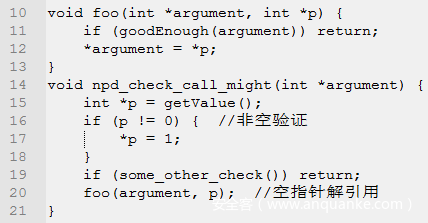 上述示例代码虽然在第16行对指针 p 进行了非空验证,但由于验证逻辑不完整,在第20行传入函数 foo 中的指针 p 仍可能为空指针。从而导致空指针解引用的发生。