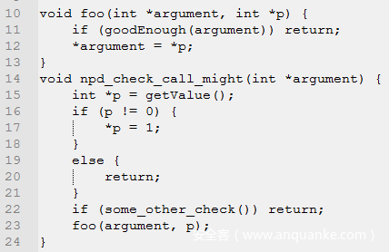 在上述修复代码中,在第19行对指针 p 为空的情况进行了处理,当指针 p 为空时,函数 npd_check_call_might() 返回,避免了第23行传入函数 foo 中的指针 p 为空指针。