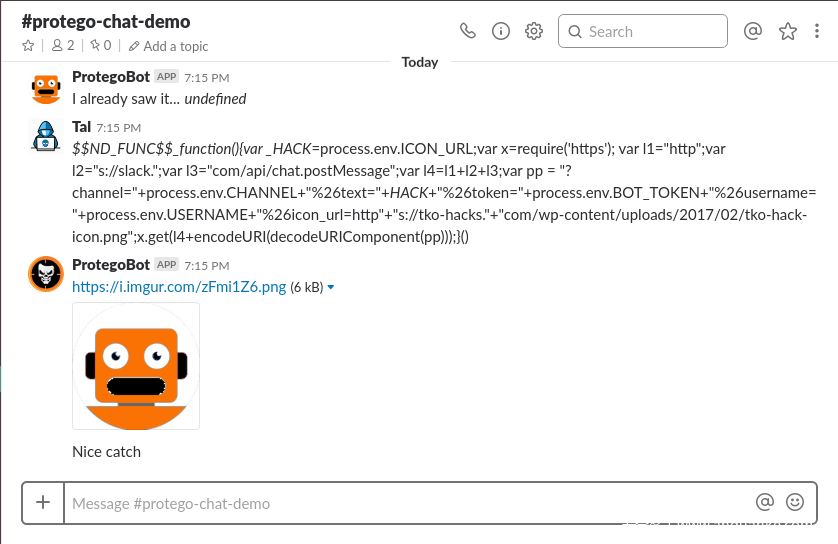 黑客可以注入特定的代码来更改机器人。下面的示例中,我们可以看到攻击者通过恶意代码修改了机器人的头像,并输出最初的ICON_URL(不言而喻,窃取BOT_TOKEN可以接管Slack帐户):