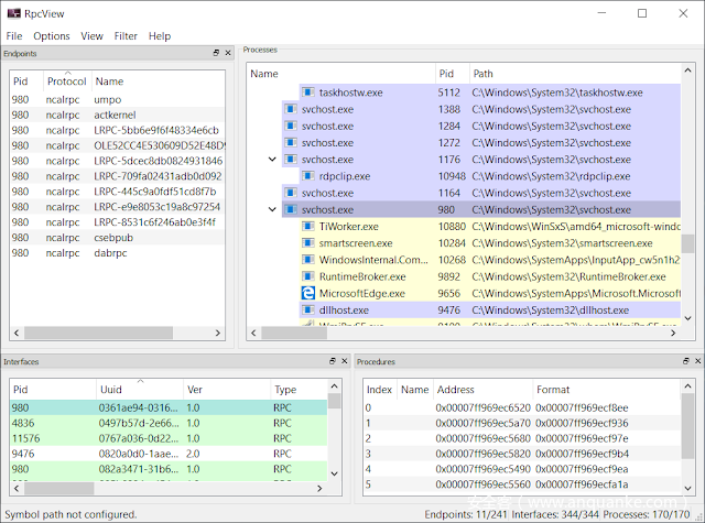步骤2:解析服务对应的APPINFO.DLL可执行文件,从DLL中提取所有RPC服务端,然后根据接口ID过滤出我们感兴趣的RPC服务端。此外,我们还可以在Get-RpcServer中添加DbgHelpPath参数,指向Windows提供的调试工具中的DBGHELP.DLL副本,通过公开符号来解析对应的方法名。我们将在步骤3中使用其他方法,确保获取到正确的函数名。