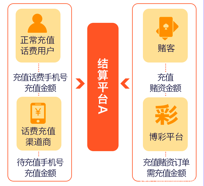 非法结算团伙,将话费充值渠道商充值订单信息与赌博平台充值订单对接。