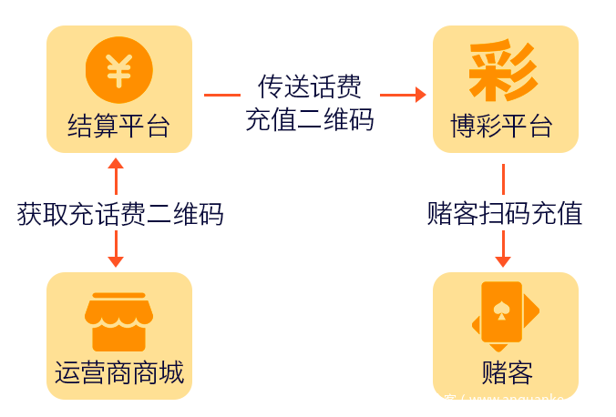 结算平台将正常用户需充值的手机号、充值金额递交到运营商商城,获取待充值二维码。将此二维码通过博彩平台传递给赌客。赌客扫码充值后,为正常用户完成话费充值操作。